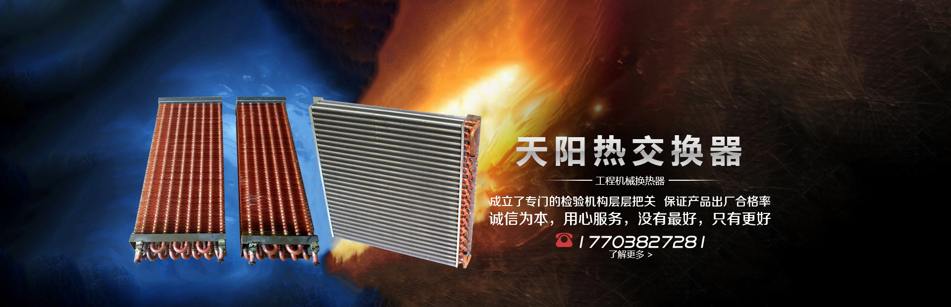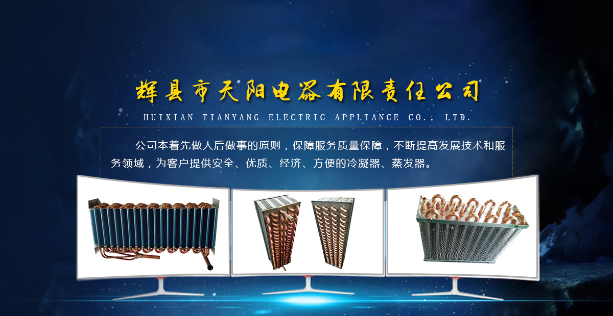 輝縣天陽電器有限責任公司位于肥沃的中原河南省輝縣市學院路中段工業集聚區興業園3號廠房,以制冷設備用冷凝器,蒸發器,熱交換器為主。主要材料為銅管鋁翅片,銅管銅翅片,鋁管鋁翅片。廣泛應用于冰箱冰柜,制冷設備,暖通設備,空調,自動售貨機,冷干機,超市立風柜,冷藏車,烘干機等產品領域。  公司自1998年成立以來,始終堅持:“科技造就產業、質量成就信譽、誠信鑄就輝煌”的質量方針,從產品拓展上堅持“人無我有,人有我優,人優我特的”經營理念,25年來,從1998年開始供應河南冰熊集團下屬的冷柜廠,制冰機廠各種冷凝器;2003年之后,原冰熊集團的精英志士開始在全國各地發展,所到之處依托我公司供貨,以致于多家目前已具行業中佼佼者的公司,從而建立了如凱雪公司,兆邦公司、凌云公司、海寶公司、正雪公司、上海忠云、山東德萊維等幾十余家公司在草創時期的啟蒙供貨商,友好共贏長達十余年,成為我國制冷行業的供應商。以致在2015年初雙匯集團面向社會的招標書中指名要我公司冷凝器、蒸發器指定產品供應商